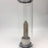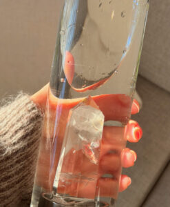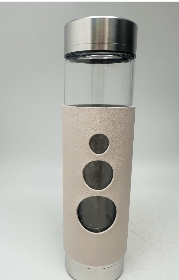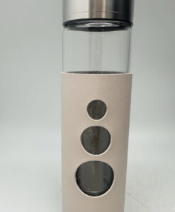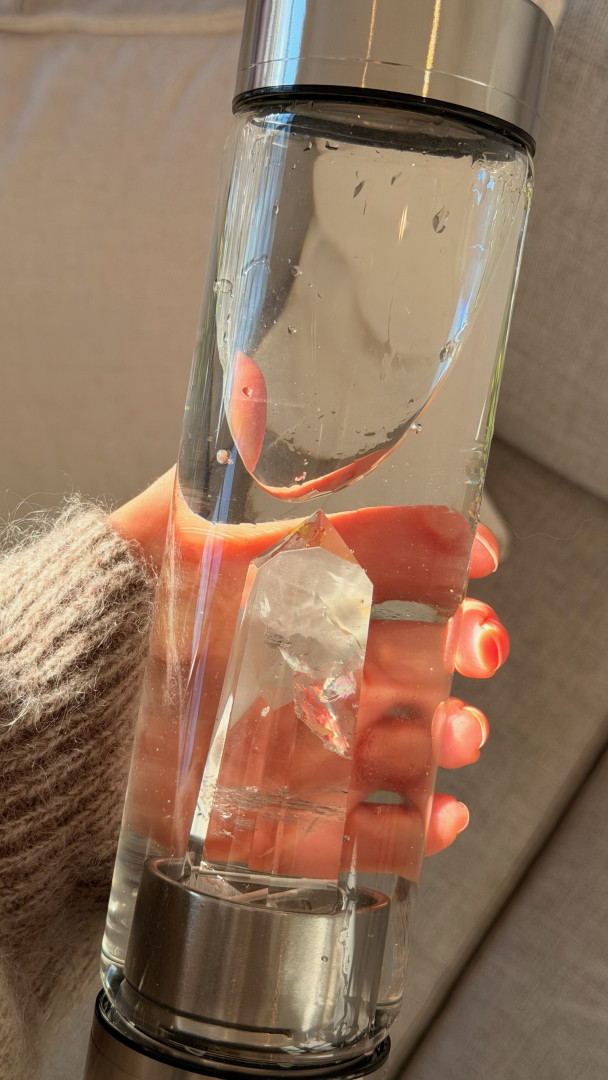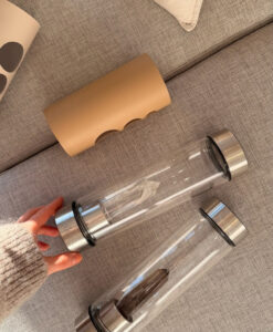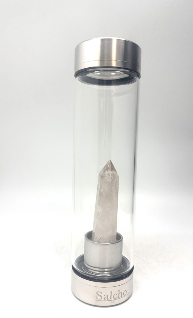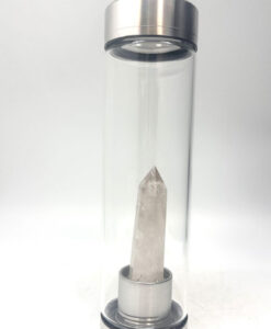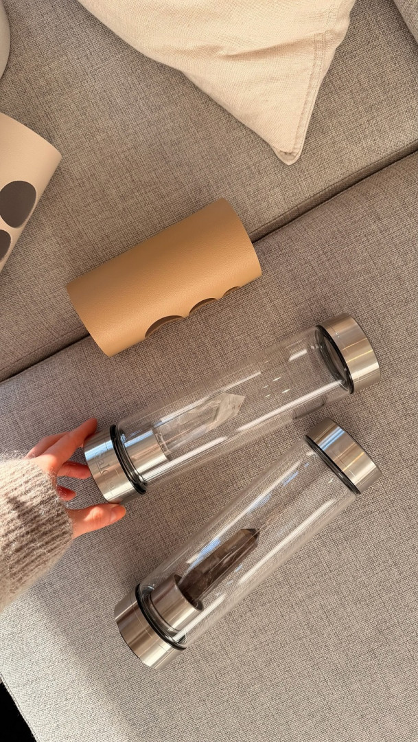 Lekker glassflaske med stor bergkrystall inni. Vi anbefaler vann på flasken. men kan brukes også til annen drikke. Det er skru-åpning i topp og bunn for rengjøring. Komfortabel lærbeskyttelse følger med. i tillegg til solid eske.