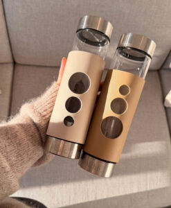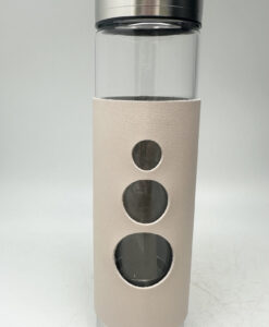 Lekker glassflaske med stor røykkvarts inni. Vi anbefaler vann på flasken. men kan brukes også til annen drikke. Det er skru-åpning i topp og bunn for rengjøring. Komfortabel lærbeskyttelse følger med. i tillegg til solid eske.