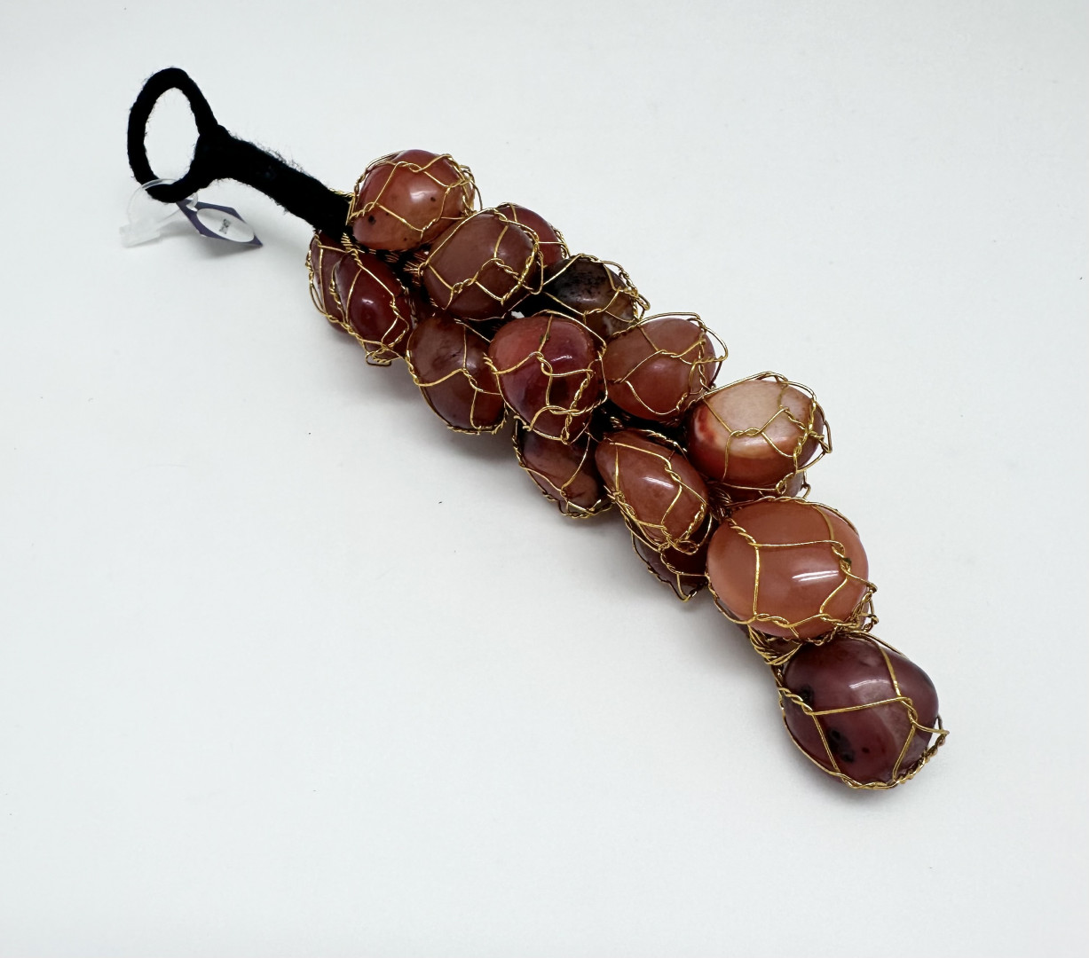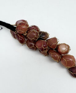 Drueklase i gylden. oransje karneol. Messingtrådene rundt steinene gjør at du kan forme «druene» slik du selv ønsker.