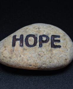 Glatt og naturlig polert elvestein i lys brunt. Inngravert «HOPE». Flott til dekorasjon alene eller sammen med annen pynt.