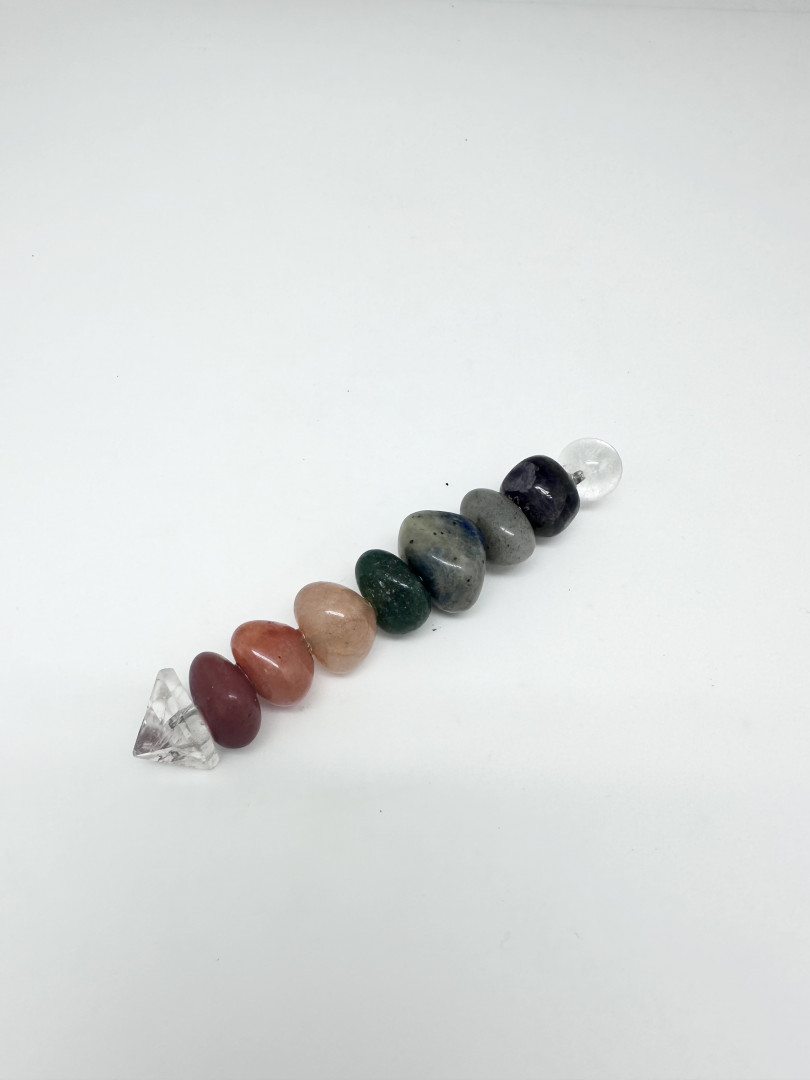 Alle chakrasteinen på en pinne med kvartspyramide og kvartskule i endene.