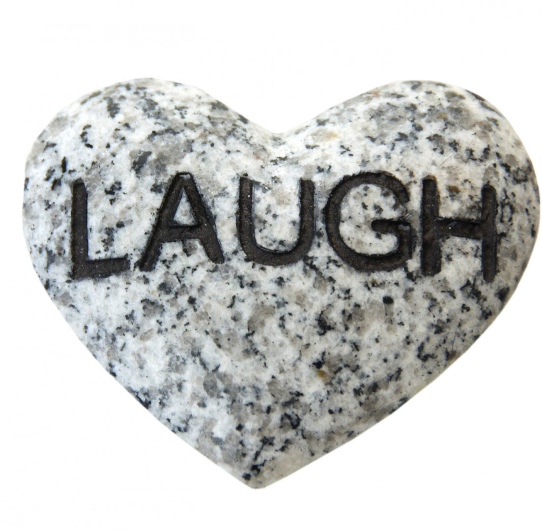 Polert hjerte i lys grå granitt. Inngravert «LAUGH». Passer flott alene eller sammen med annen pynt.