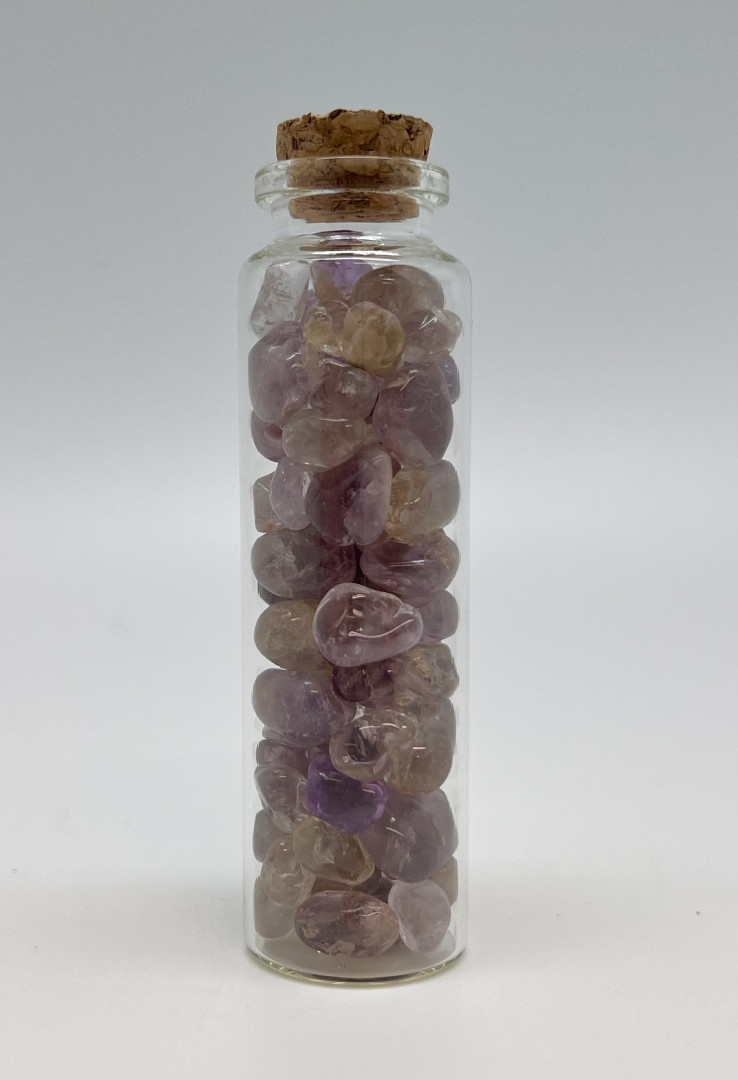 Høy glassflaske med små polerte ametyster. Flasken har kork.