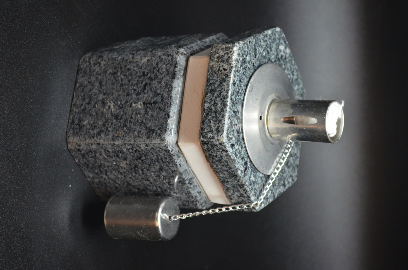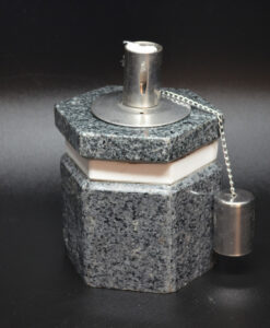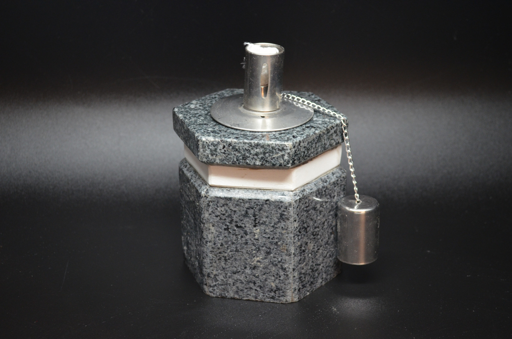 6-kantet oljelampe i mørk grå granitt med hvit dekor-kant øverst.