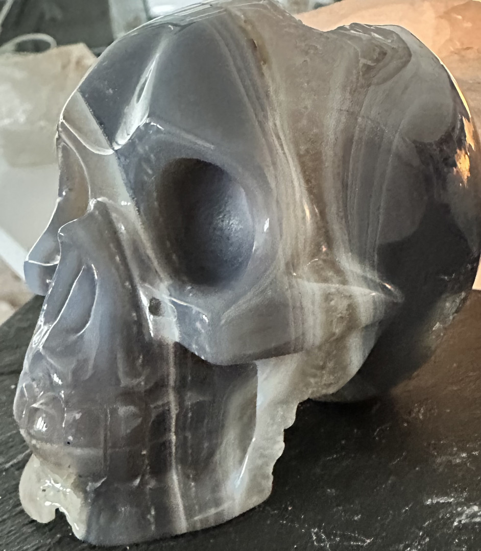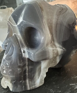 Unik utskåret skalle i agat med geodeåpning på toppen av hodet, men kvartskrystaller inni.