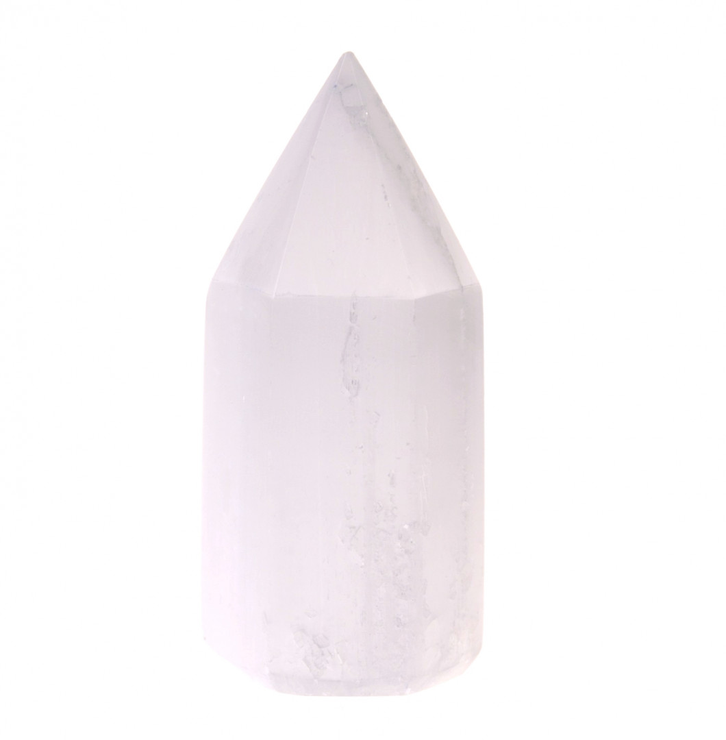 Polert, sekskantet tårn med spiss i skinnende hvit selenitt.