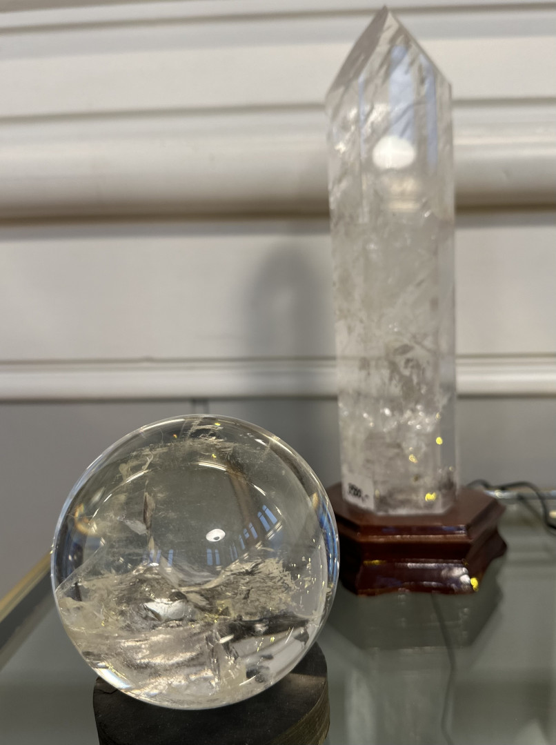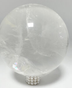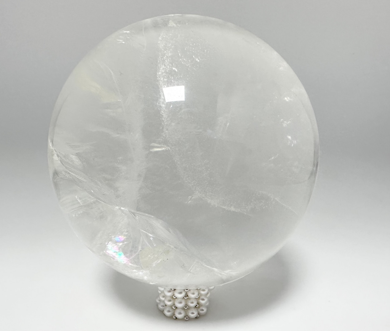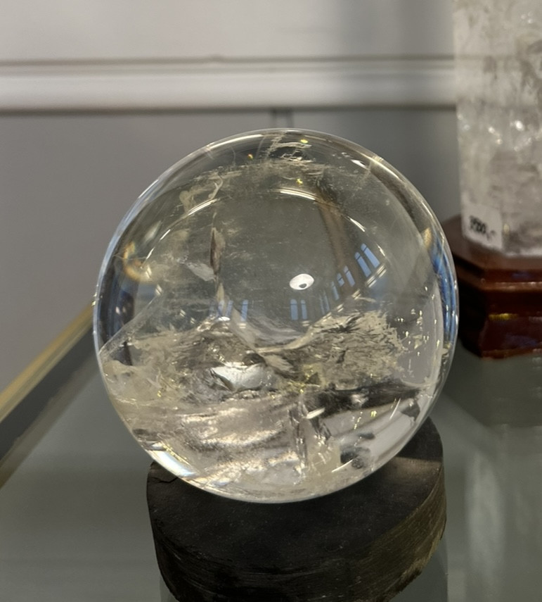 Stor, nydelig kule i kvarts som er nærmest klar og gjennomsiktig. Den er ca 10 cm i diameter.