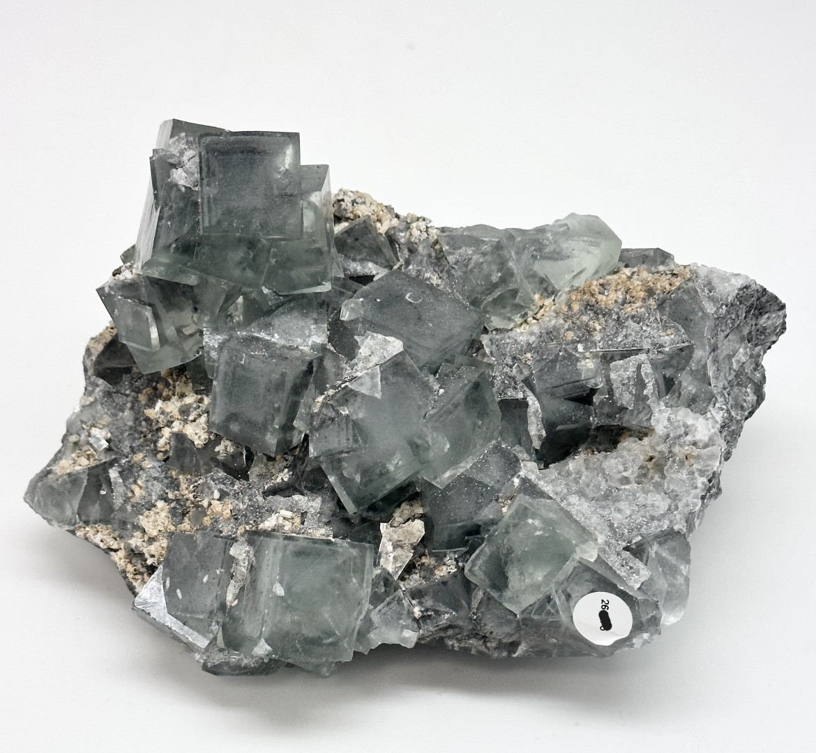 Fluoritt med mørke, grønne krystaller som er nærmest gjennomsiktige. Vekt ca. 1,6 kg