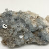 Fluoritt med grønne og gule firkantede fluoritt-krystaller. Under er det flere firkantede pyritter.