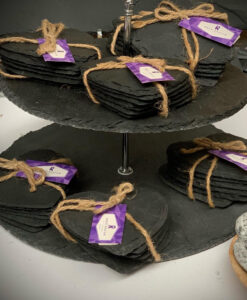 Skiferfat i 2 etasjer med metallhåndtak til å løfte i. Enkelt å montere.