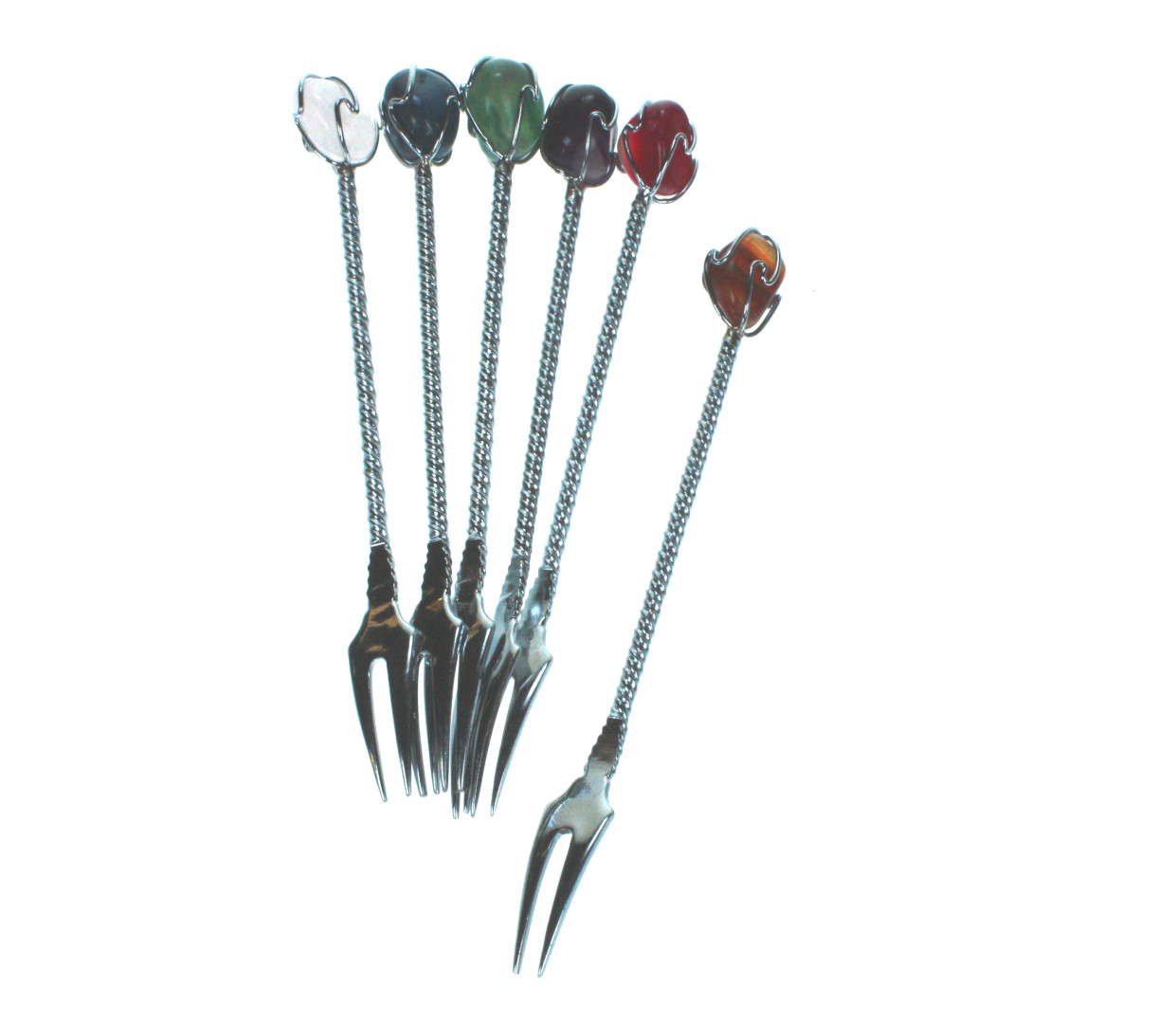 Sett med 6 stk koldgafler med polerte agat i forskjellige farger.