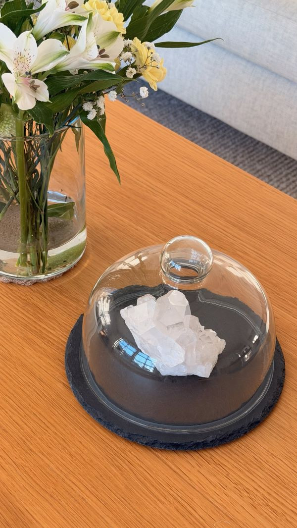 Skiferfat med glasslokk tilpasset fatet. 18 cm i diameter. Passer til ost. kaker eller dekor!