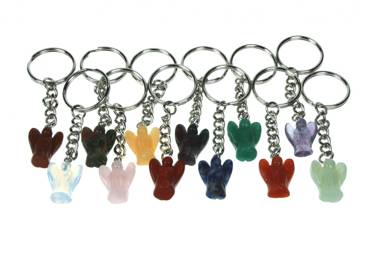Sett med 12 nøkkelringer med engler i forskjellig stein.