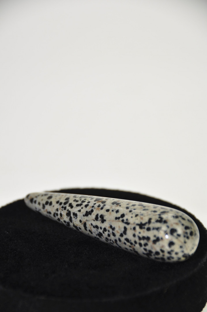 Polert massasjestav i flekkete dalmatiner jaspis som er buet i begge ender. Passer fint for massasje av både små og store muskler.