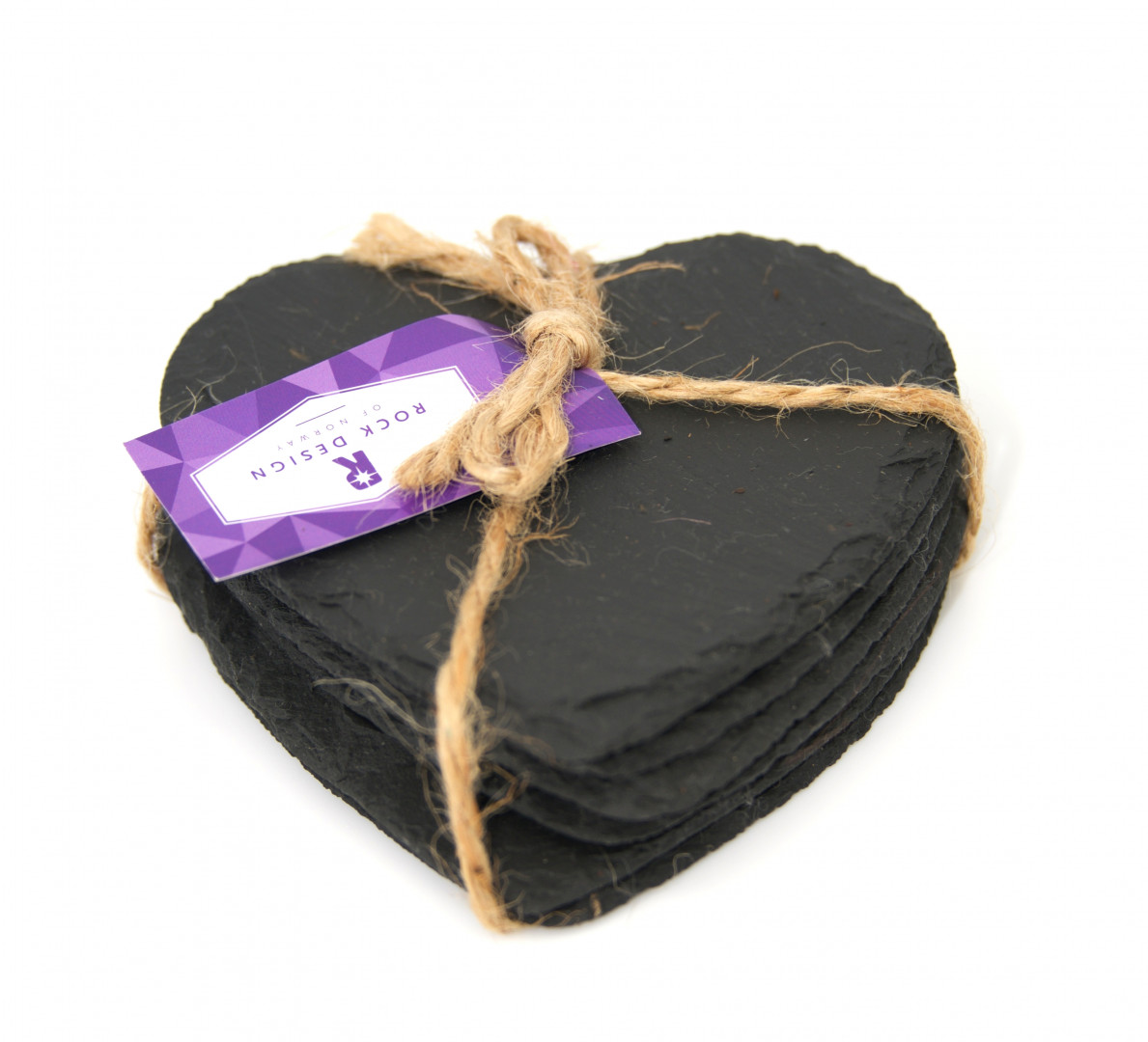 Pakke med 6 stk store hjerter. Alle er i sort skifer med gjennomgående hull øverst. Passer til alle slags dekorasjon og kan skrives på med kritt.