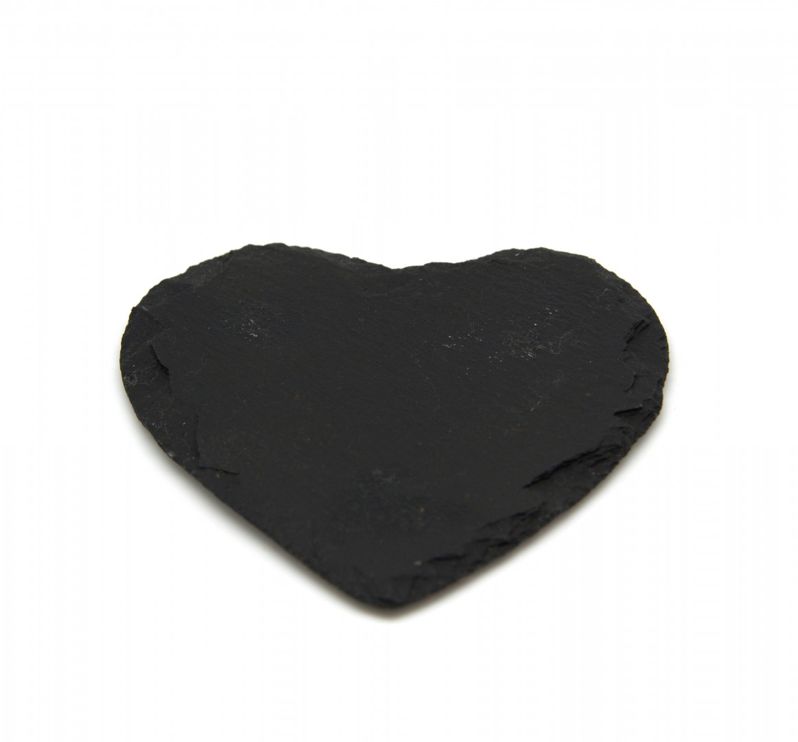 Flatt hjerte i sort skifer. Lekkert som bordkort eller til annen dekorering. 5X5cm bredt.
