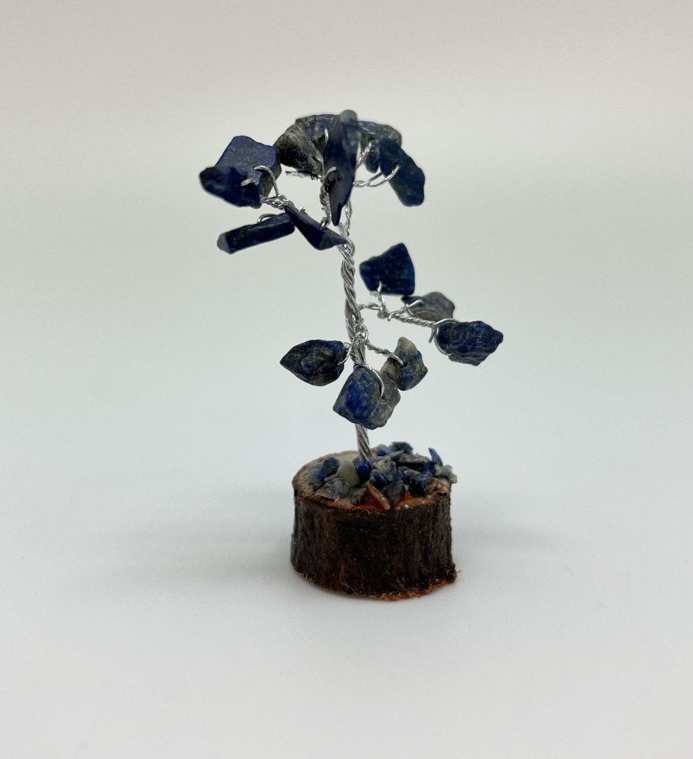Tre med små, marmorerte blå sodalitter på fot, laget med ståltråd.