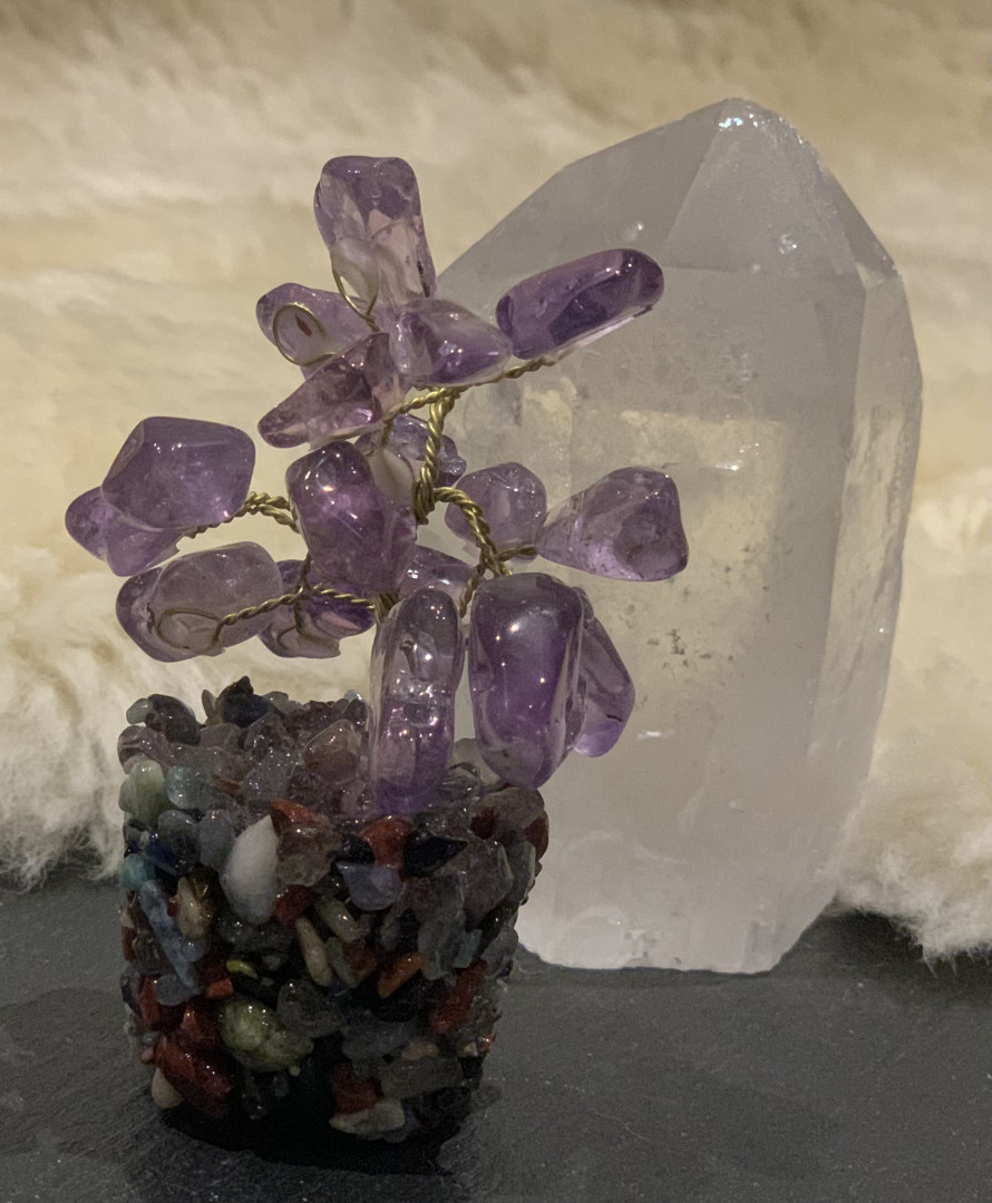 Tre med kraftige, polerte ametyster og fot laget av en mix av små agater.