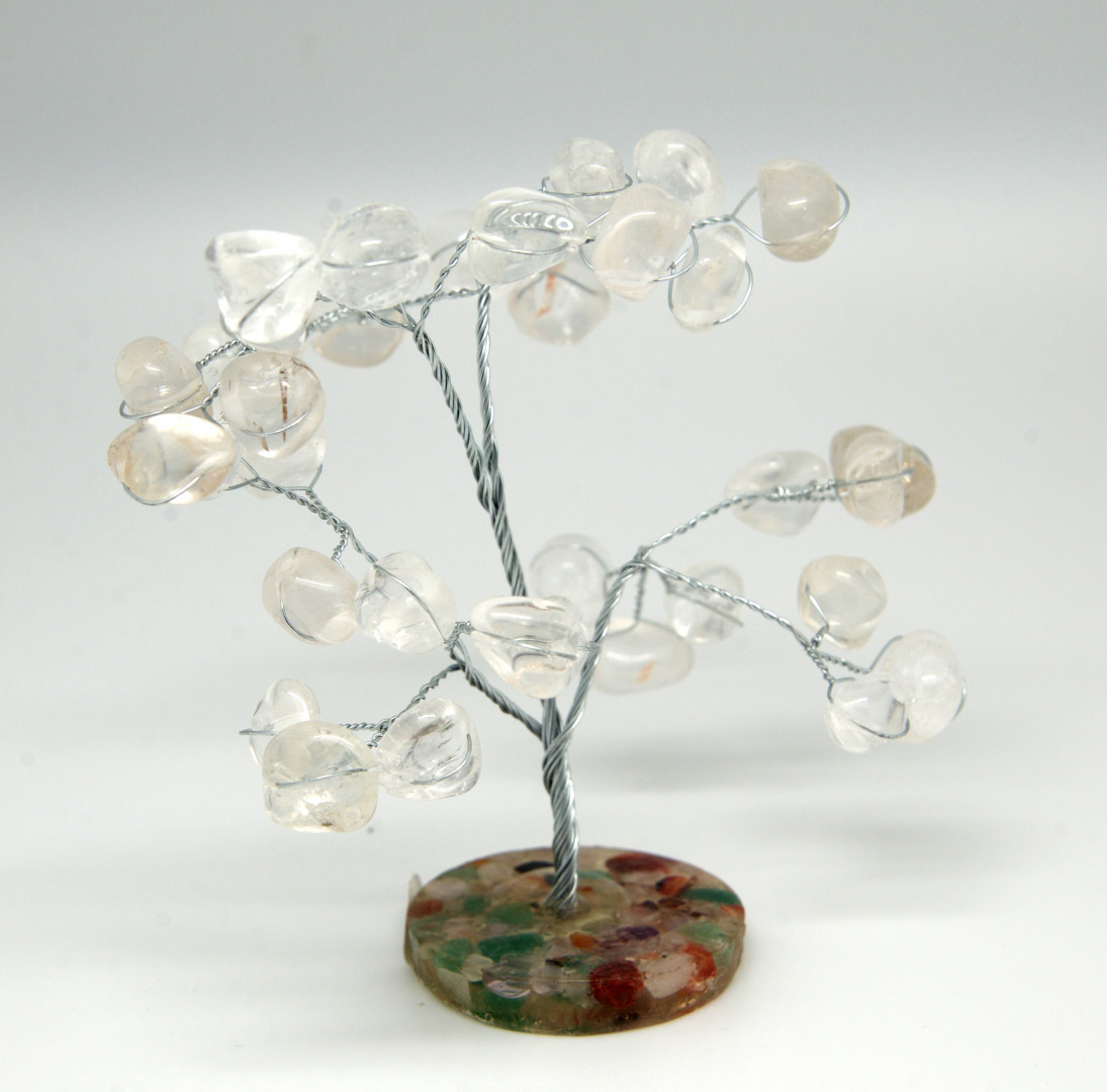 Tre med kraftige, polerte, klare bergskrystaller med i små knuste stein i forskjellige farger. Meget dekorativt!