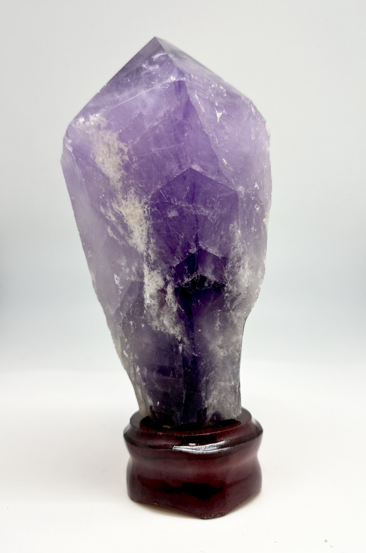 Stor, enkel ametystkrystall som er 23 cm høy på trefot.