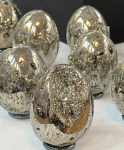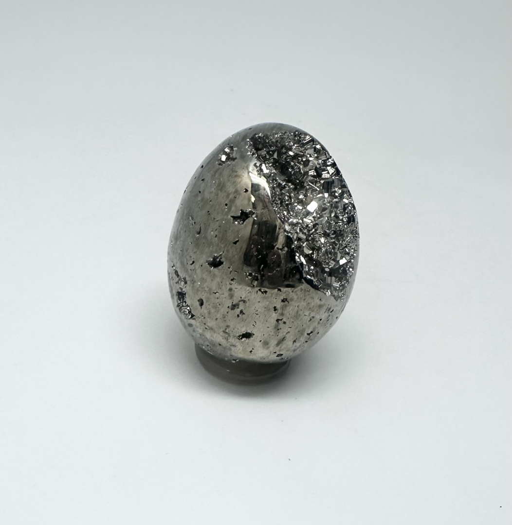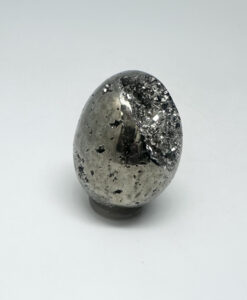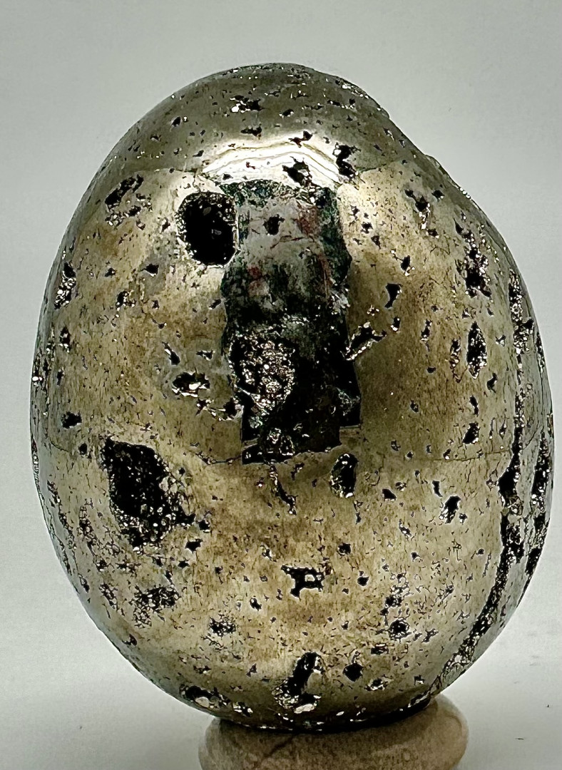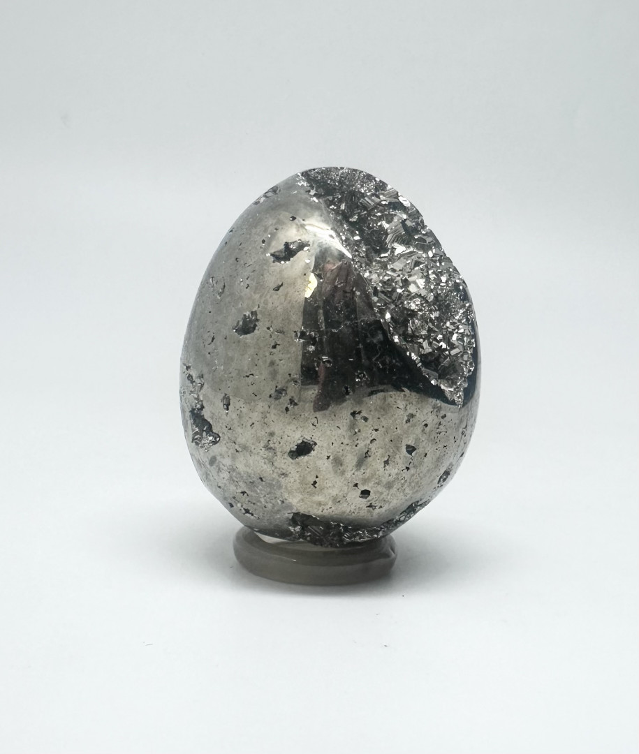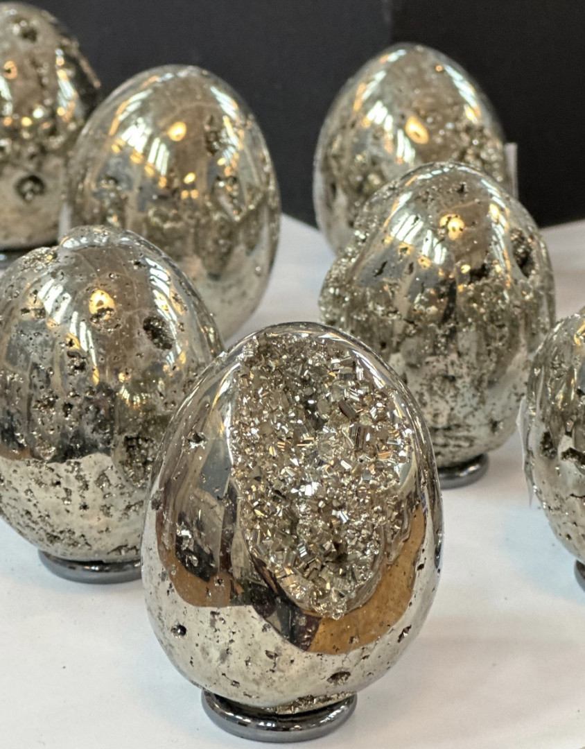 Skinnende «gull egg» i pyritt. Egget har spennende åpninger der du kan se små. glitrende krystaller som er firkantet slik pyritt danner naturlige krystaller.