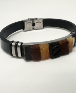 Et tøft lærarmbånd med rå Rav i forskjellige gyldne farger. Det myke læret gir et robust uttrykk sammen med metalldetaljene. Hver Rav er unik med eget mønster og nyanse.