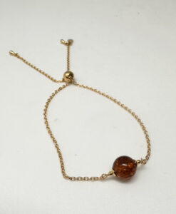Lekkert og enkelt armbånd med kule i rav. Fargen varierer fra honninggul til mørk cognac-brun. Armbåndet kan enkelt strammes og reguleres ved å skyve på den lille kulen. Armbåndet er i sølv som er gullbelagt og har en lenke som kalles «løkke». Det er lette sammensatte ringer. Kulen er ca. 10mm stor. Leveres i smykkeeske.