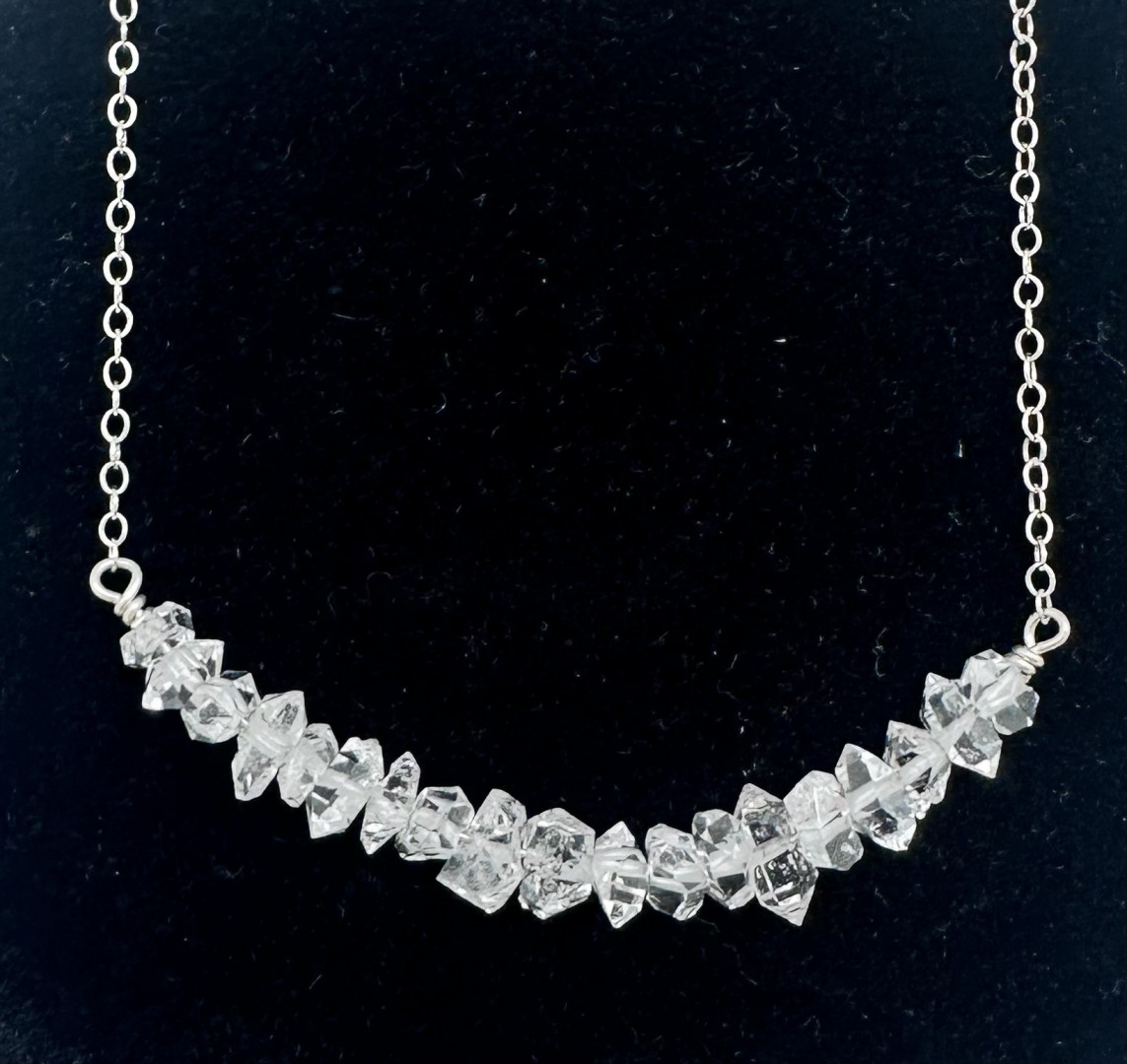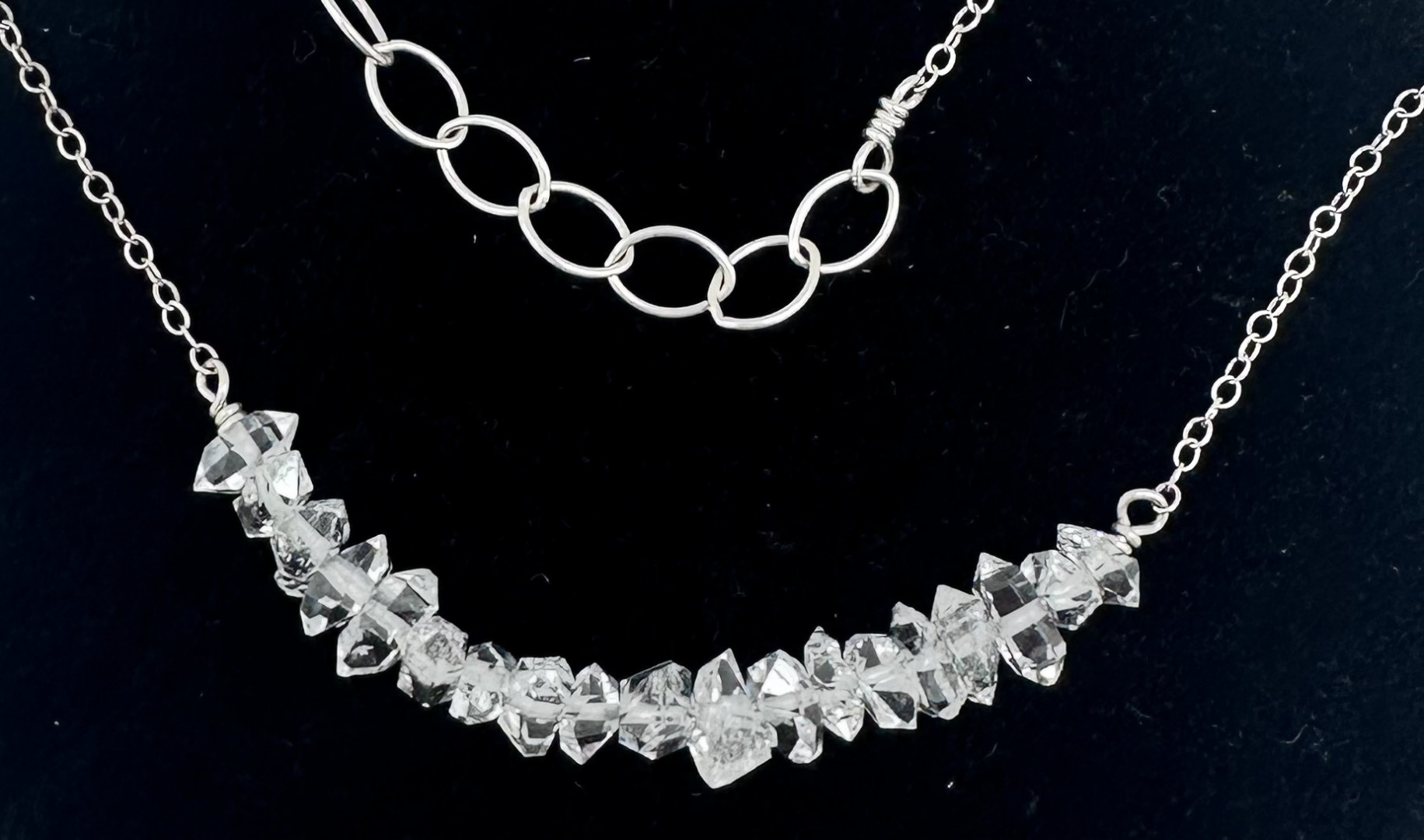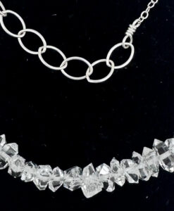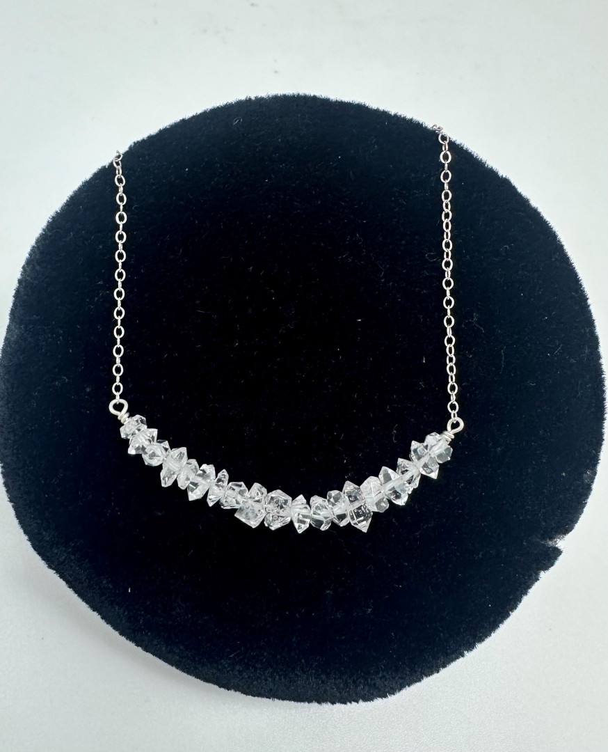 Sølvkjede med naturlige Herkimer-diamanter i fronten. Dette er et helt unikt kjede der du får 19 Herkimer-diamanter som er naturlige [ikke slipt]. De henger i fronten på et lekkert sølvkjede. Kjedet har en reguleringslengde på 5 cm. 40-45 cm langt. Det finnes kun et av dette kjedet!