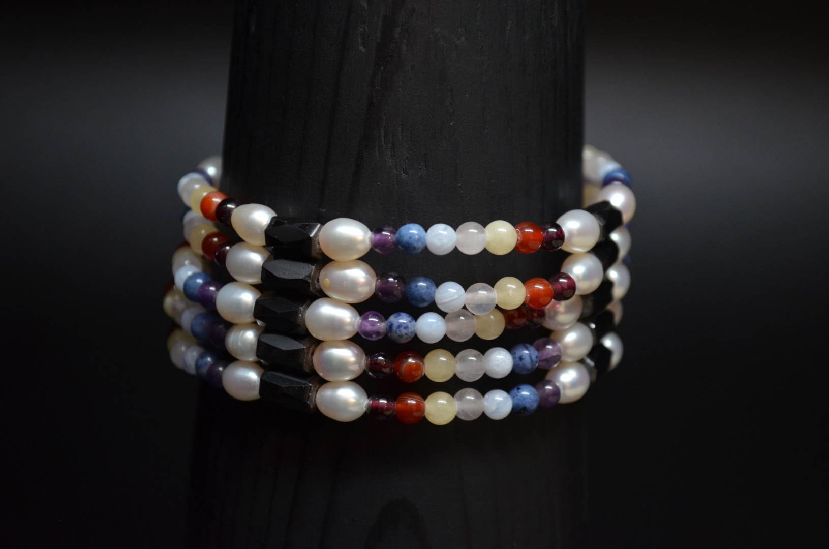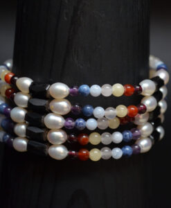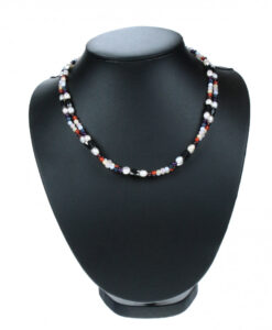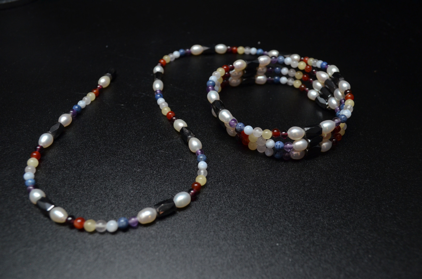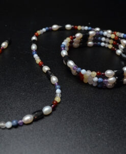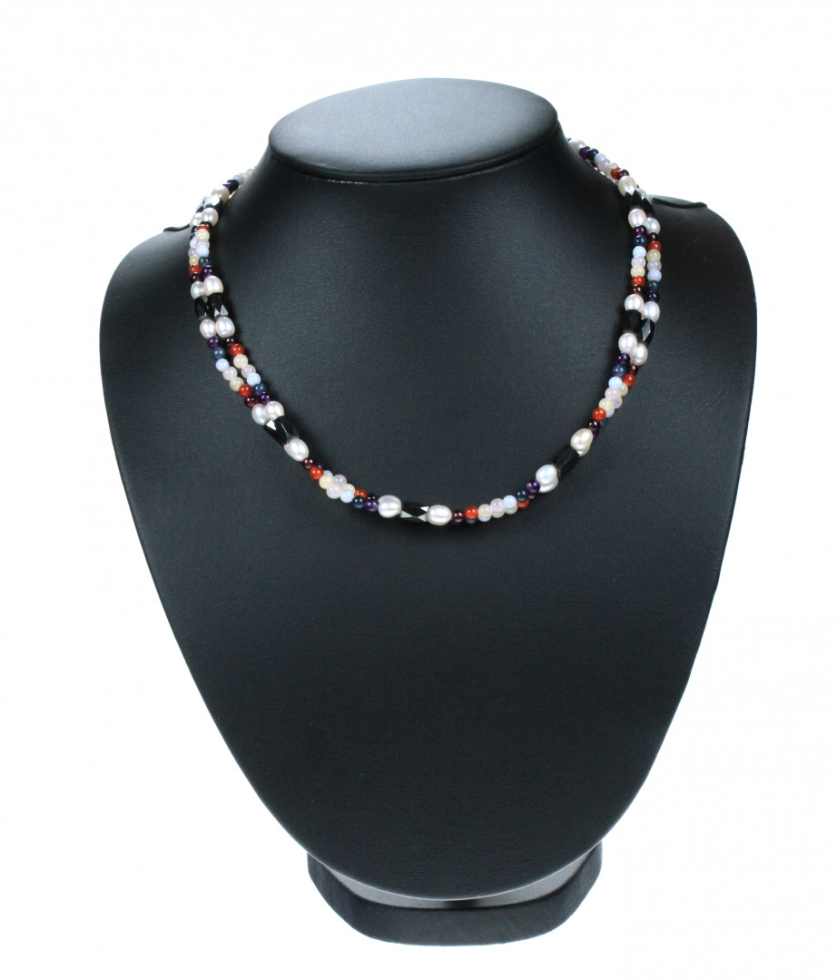 Magnetisk kjede med hematitt. perler og stein i ulike farger. 100cm langt.