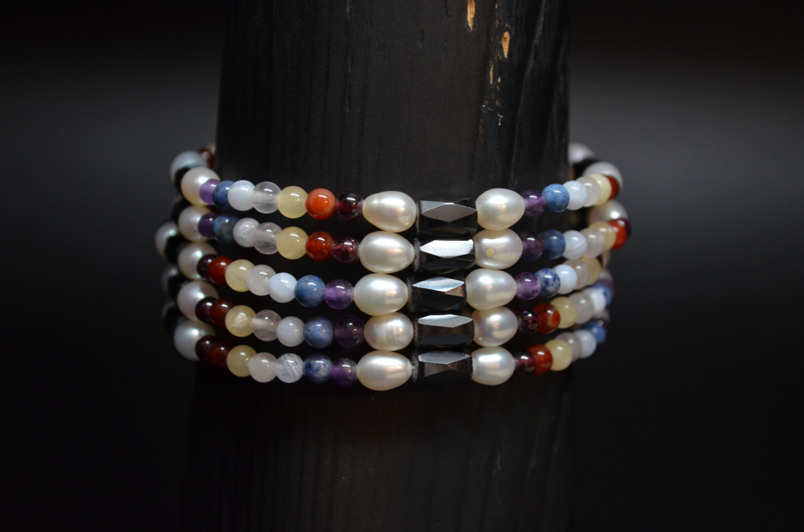 Armbånd med magnetisk hematitt, perler og kuler i forskjellige farger. Kan også brukes som et kort halskjede eller barnkjede.