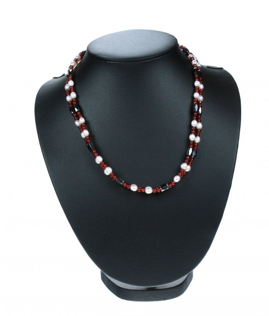 Magnetisk kjede med klar, rød agat, perler og magnetisk hematitt. Kan også brukes som bredt armbånd.