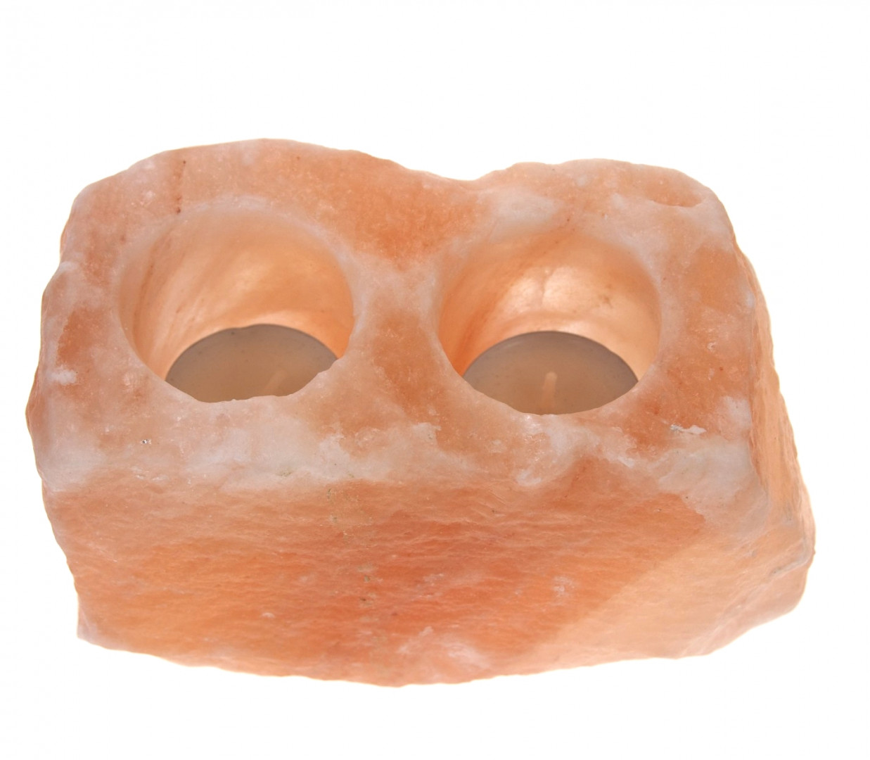 Te-lys i saltstein med 2 hull til telys. Saltsteinen varierer i farge, fra lys til mørkere oransje.