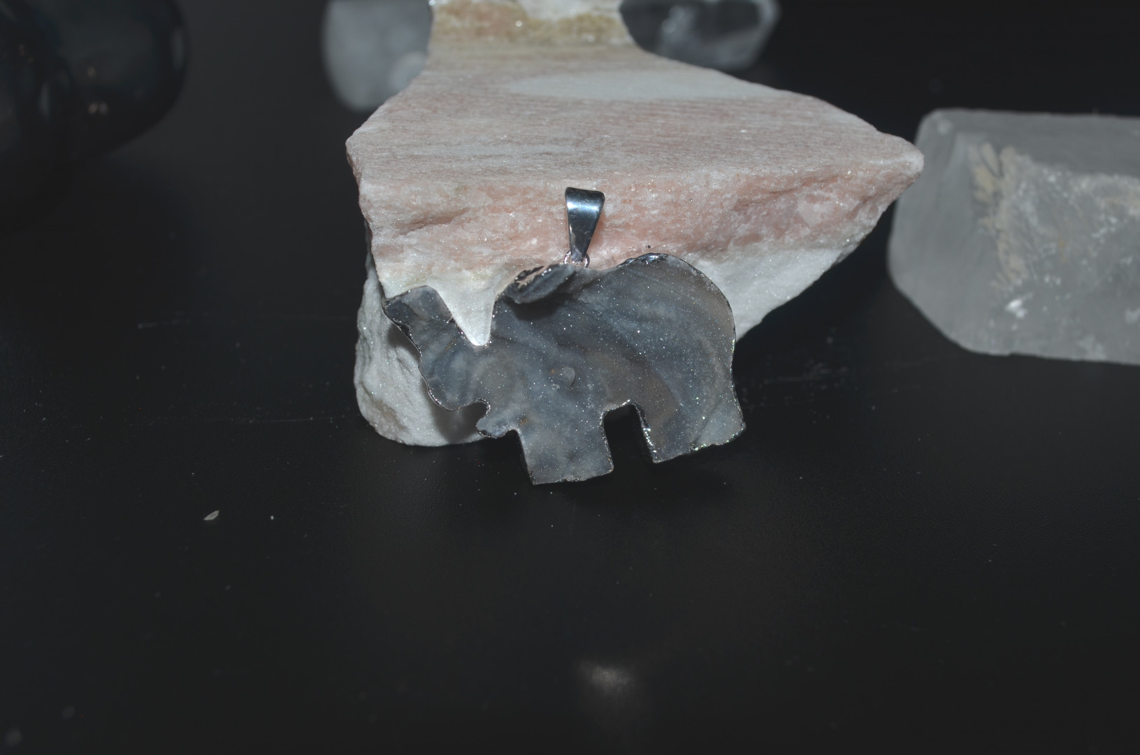 Elefantformet anheng i glitrende agatdruse med sølvkant.