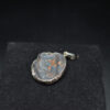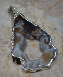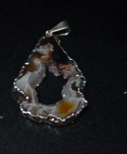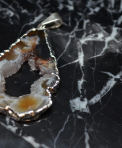 Skive av geode belagt med sølv rundt kanten og oppheng til kjede.