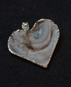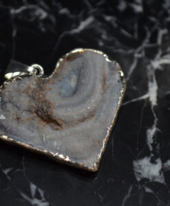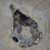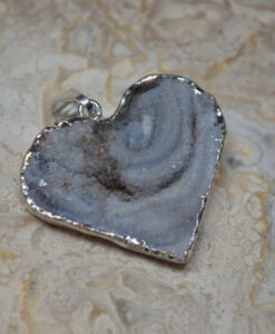 Rundt anheng i agatdruse med flotte, duse farger og små glitrende krystaller. Passer fint å ha i lærsnor eller langt sølvlenke. Belagt med sølv rundt.