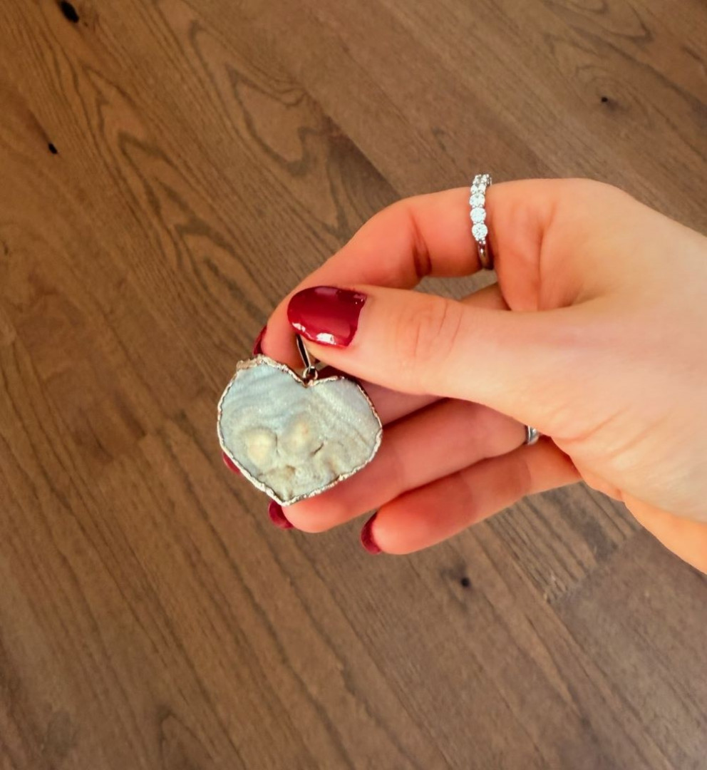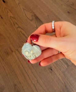 Anhenget er i lysblå/lysgrå og mønsteret er varierende siden det er helt naturlig! Ca. 3cm x3cm.