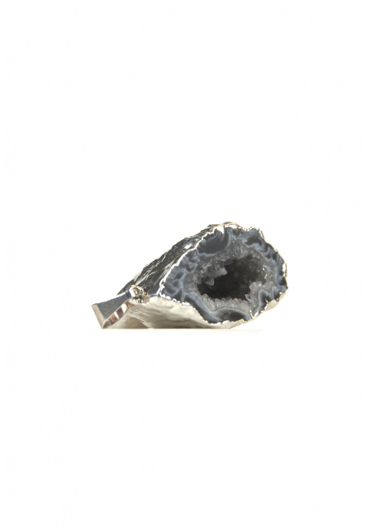 Åpen geode belagt med sølv på baksiden. Oppheng til kjede.