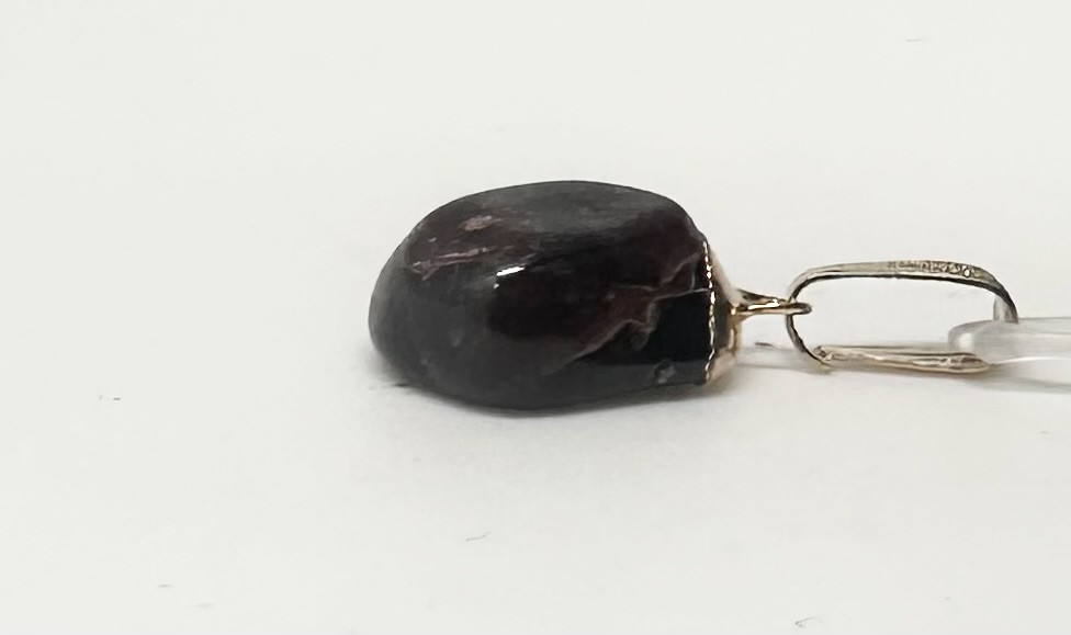 Anheng med polert granat med oppheng for kjede. Granat en mørk rød. nesten sort. edelsten som har vært bruk til smykker i flere tusen år.