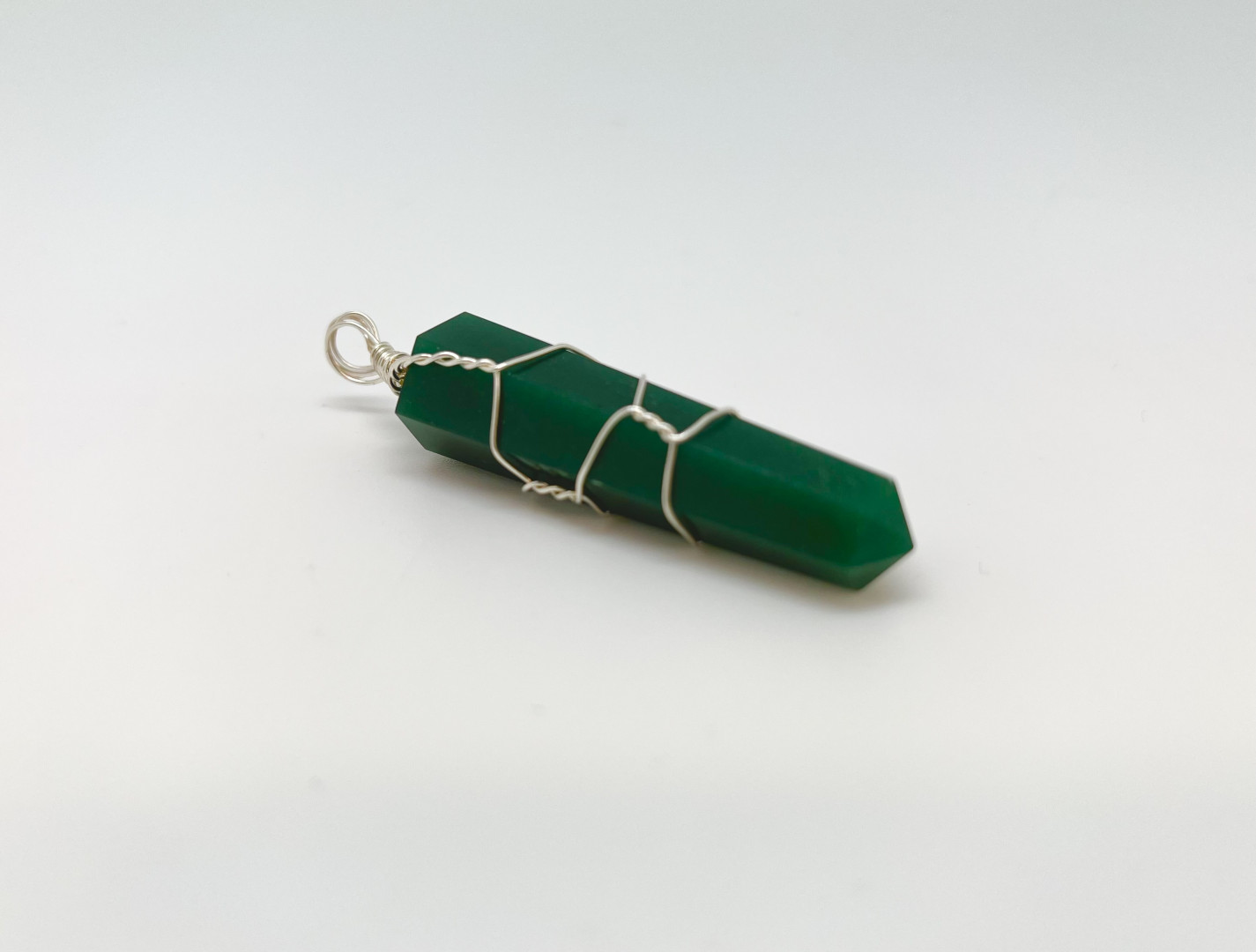 Polert anheng i mørk grønn kvarts med metalltråd flettet rundt og oppheng til kjede.