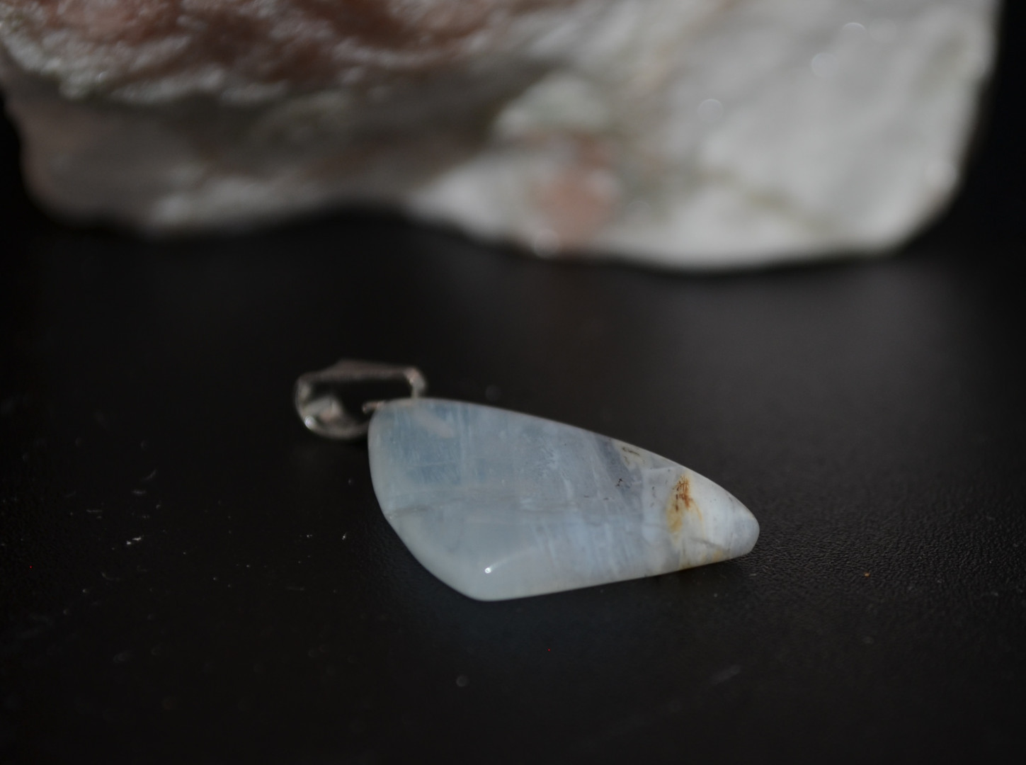 Anheng i lys grønn, skinnende opal med sølvfarget oppheng til kjede.