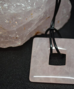 Kvadratisk anheng i flott rosa kvarts med hull til lærsnor.