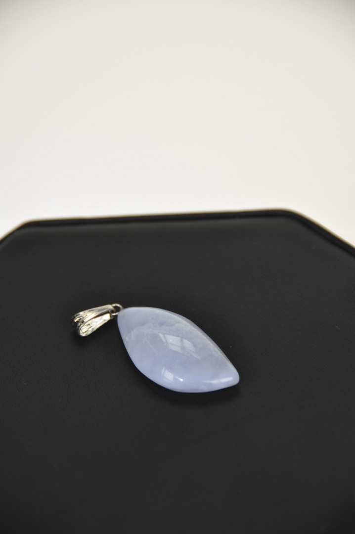 Lys blå og lekker kalsedon, tromlet og polert med sølvoppheng for kjede. Dersom du er født i stjernetegnet »skytten» er kalsedon din lykkestein.