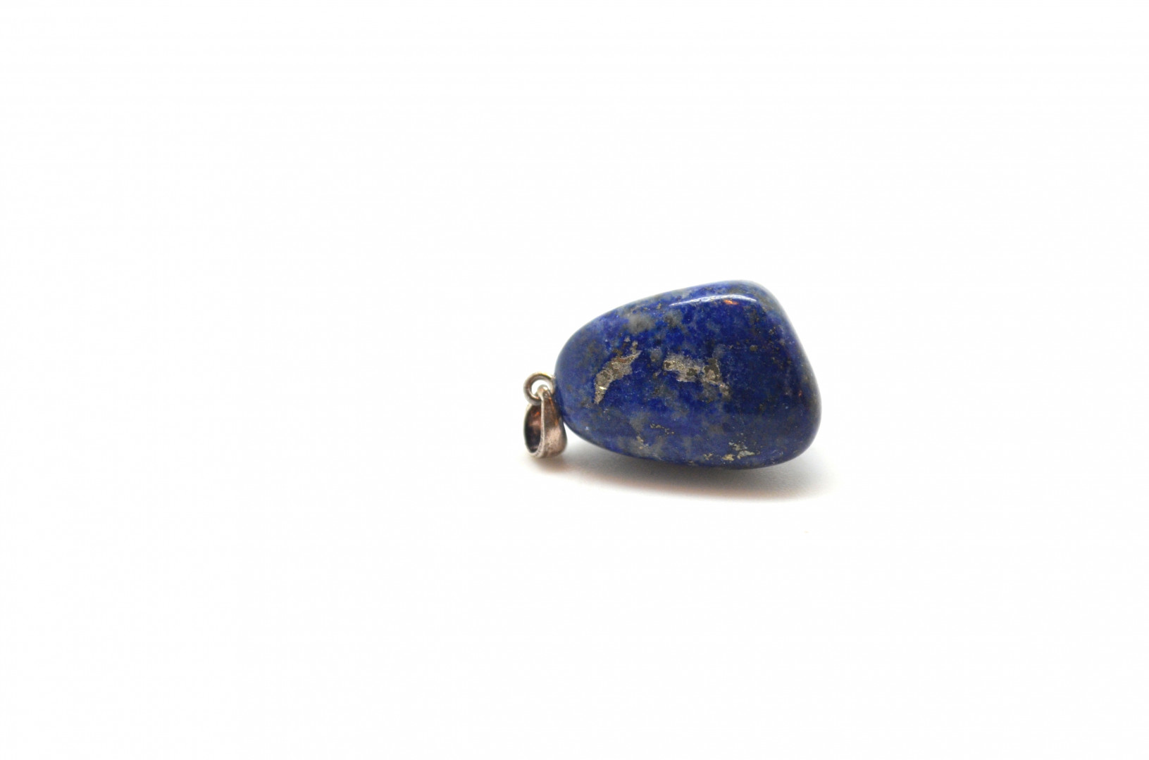 Polert anheng i lekker blå lapis med hvite marmoreringer. Anhenget har sølvoppheng for kjede.