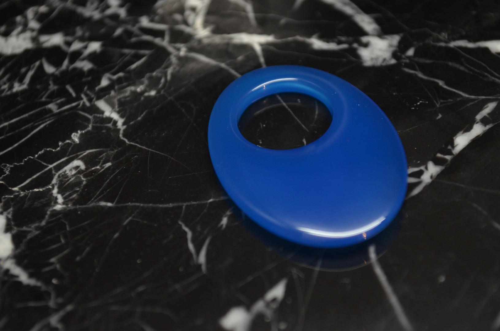 Oval donut i lys blå agat med stort hull til lærsnor.