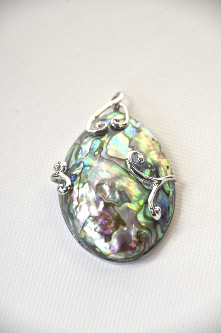 Stort pauaskjellanheng med metalloppheng og lekre metalldetaljer foran.