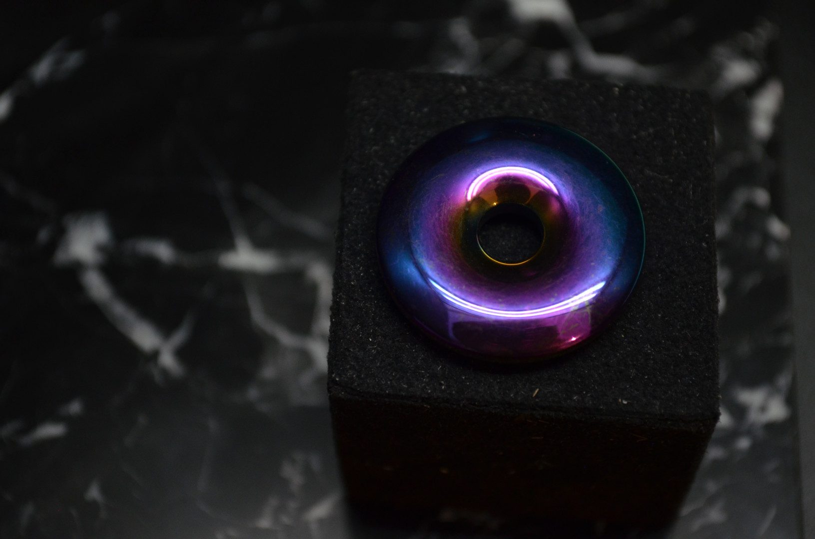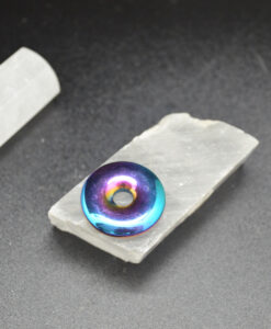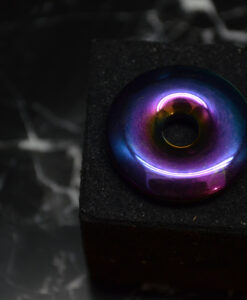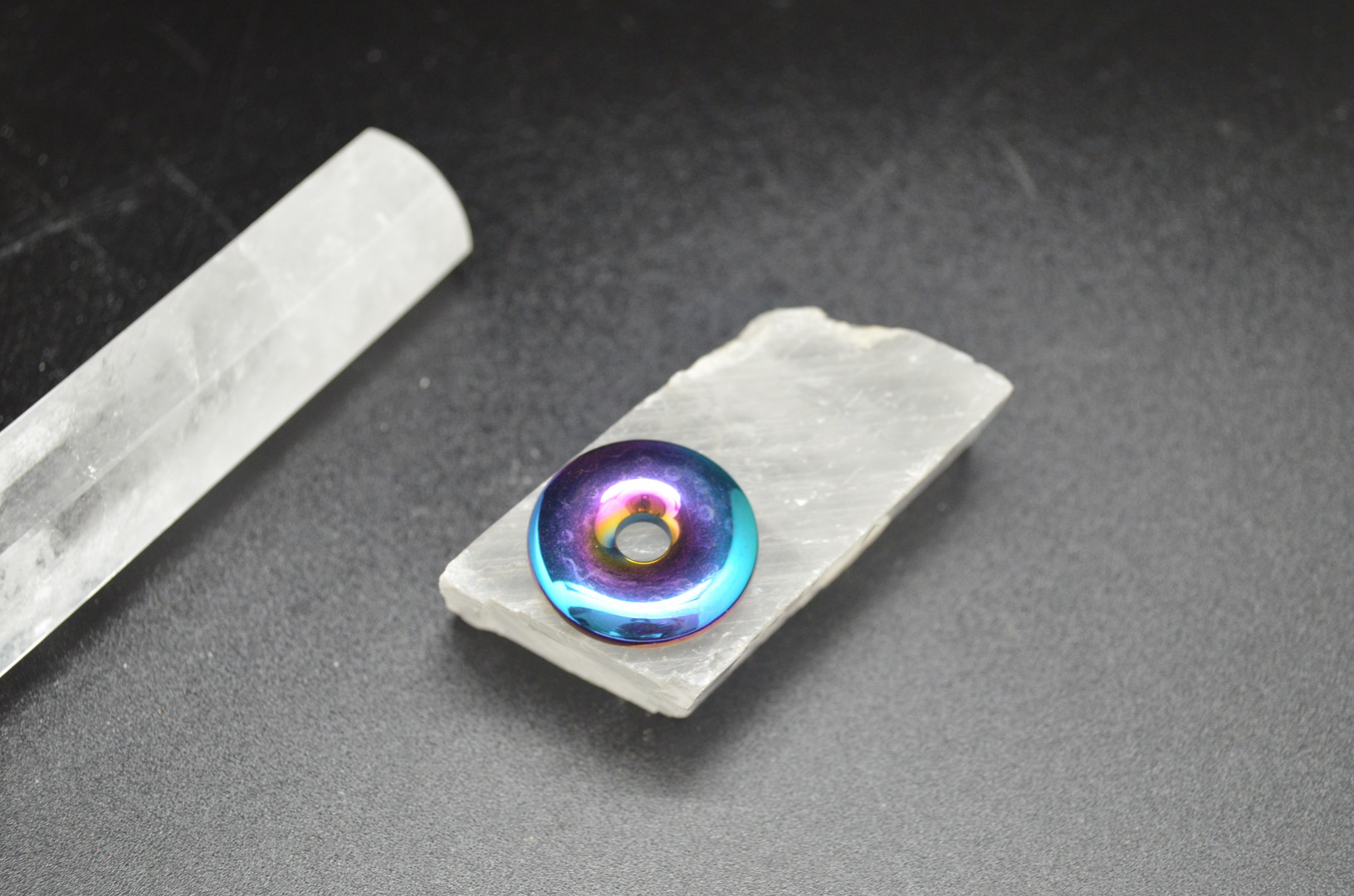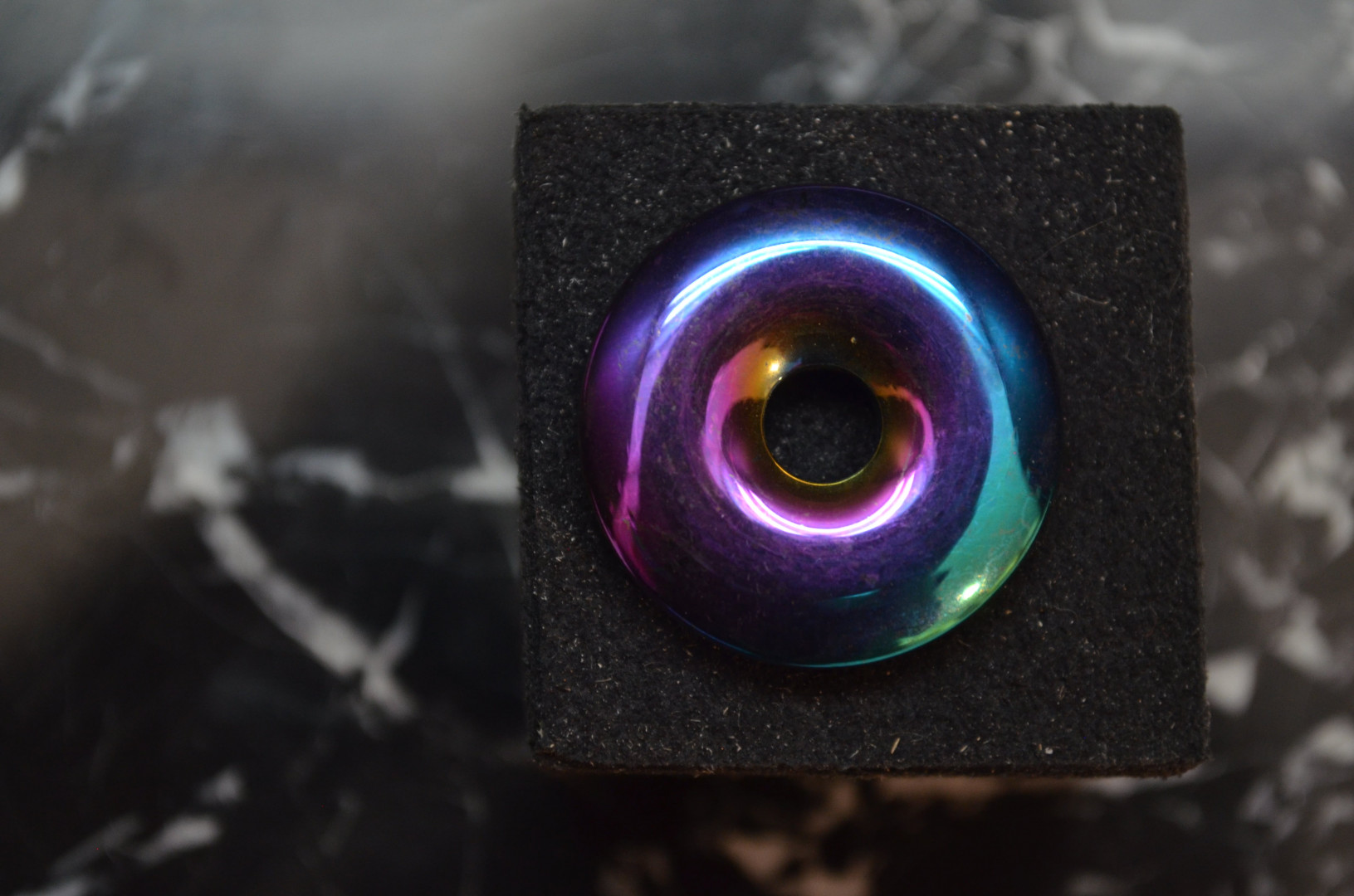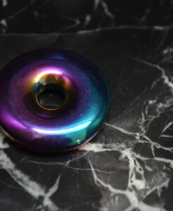 Hematitt sirkel som skinner i alle regnbuens farger. Flott sammen med lærsnor.