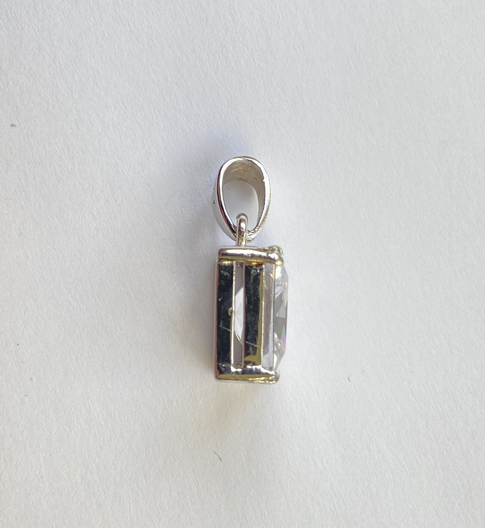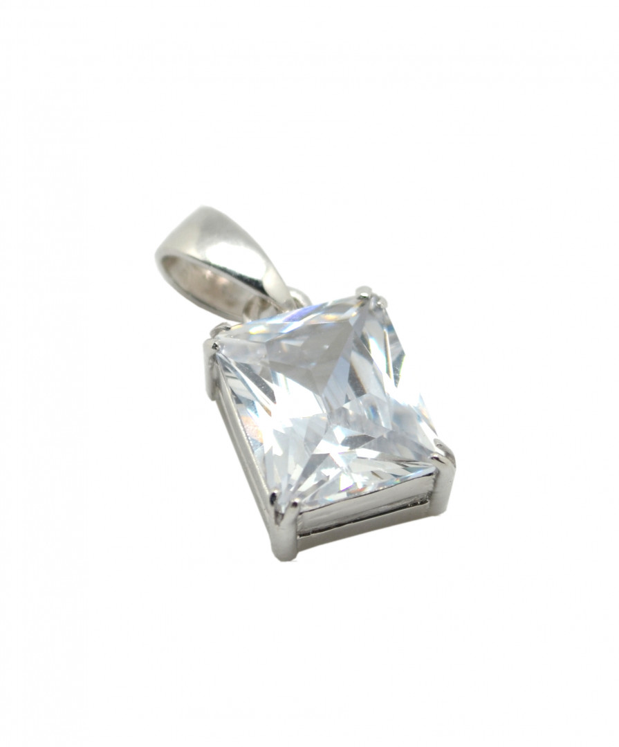 Klar, rektangulært, facettslipt anheng i zirkon. 12x10mm med sølv.