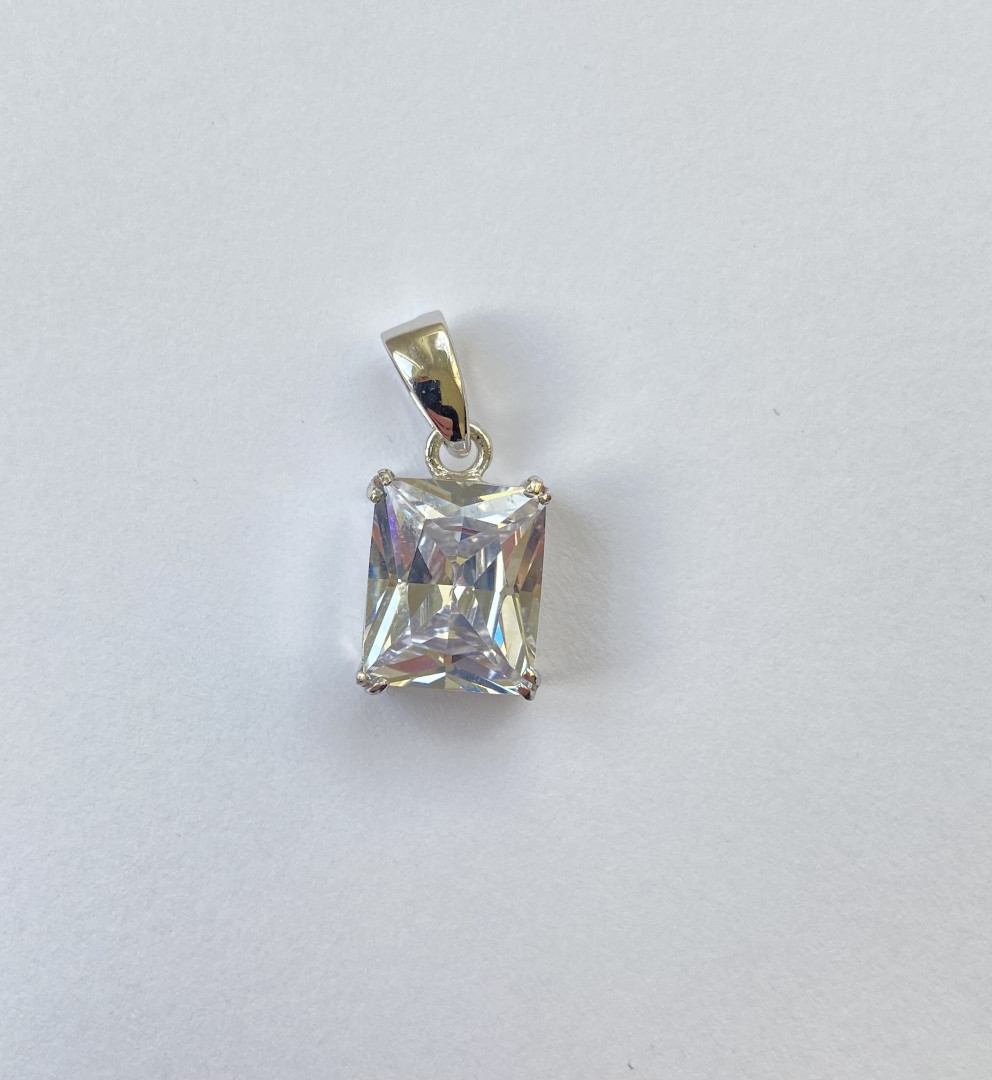 Klar. rektangulært. facettslipt anheng i zirkon. 12x10mm med sølv.