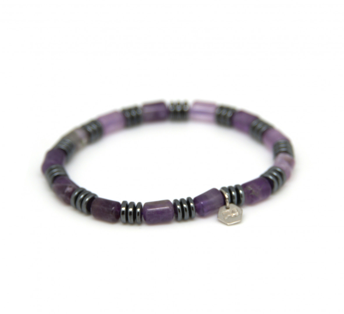 Elastisk armbånd med trommeformede, lilla ametyst og 3 sammenhengende flate hematitter.