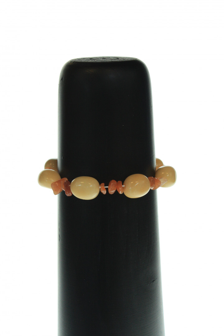 Elastisk armbånd med tromlede stein i gul aragonitt og små chips i rød aventurin innimellom.